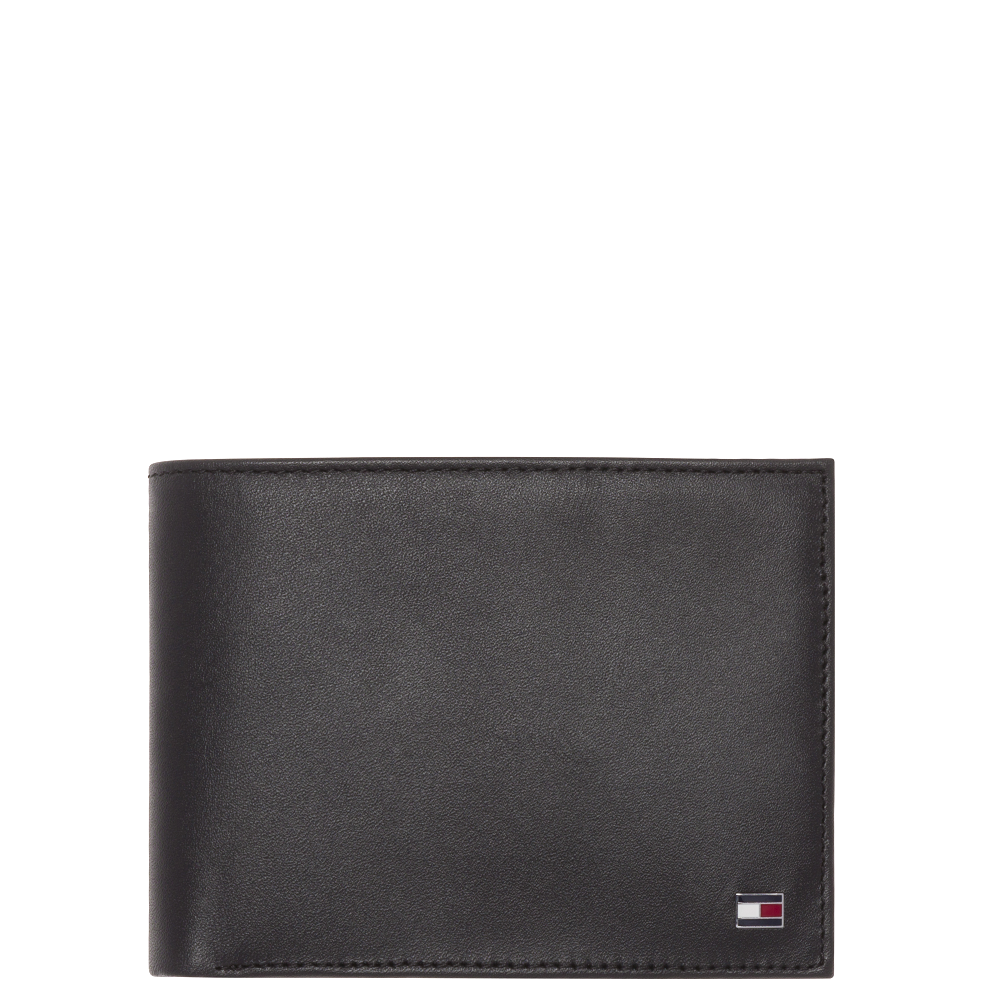 Ανδρικό πορτοφόλι σε μαύρο χρώμα της εταιρείας TOMMY HILFIGER. Κατασκευασμένο από δέρμα σε συνεργασία με το Leather Working Group, δέρμα που προέρχεται από βιώσιμο βυρσοδεψείο το οποίο έχει βραβευτεί για τις περιβαλλοντικές του πρακτικές, διαθέτει δυο ξεχωριστές θέσεις για χαρτονομίσματα, θήκες για πιστωτικές κάρτες, επιπλέον 4 θέσεις για κάρτες και τσέπη για κέρματα.